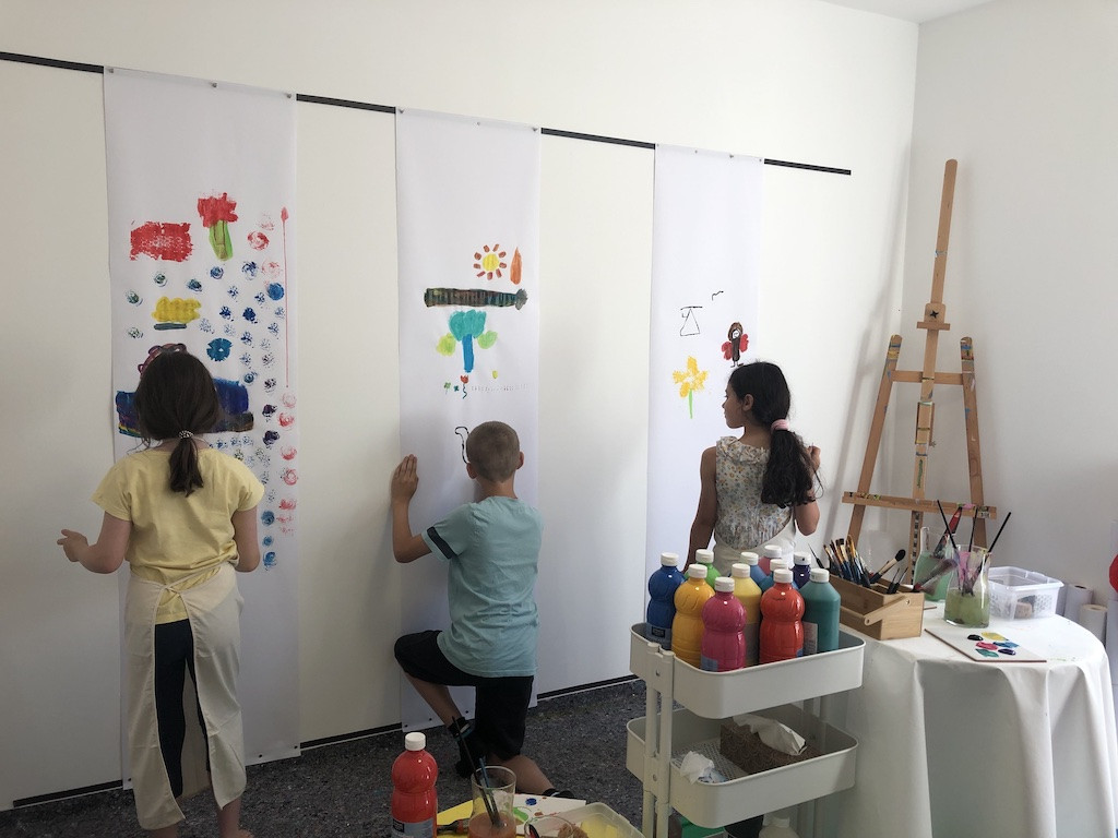 Kreative Kurse mit Aquarell, Acryl & Musik – Kinder malen frei oder nach Anleitung an der Wand & mit Händen, Pinseln oder Schwämmen. Einstieg jederzeit möglich.
